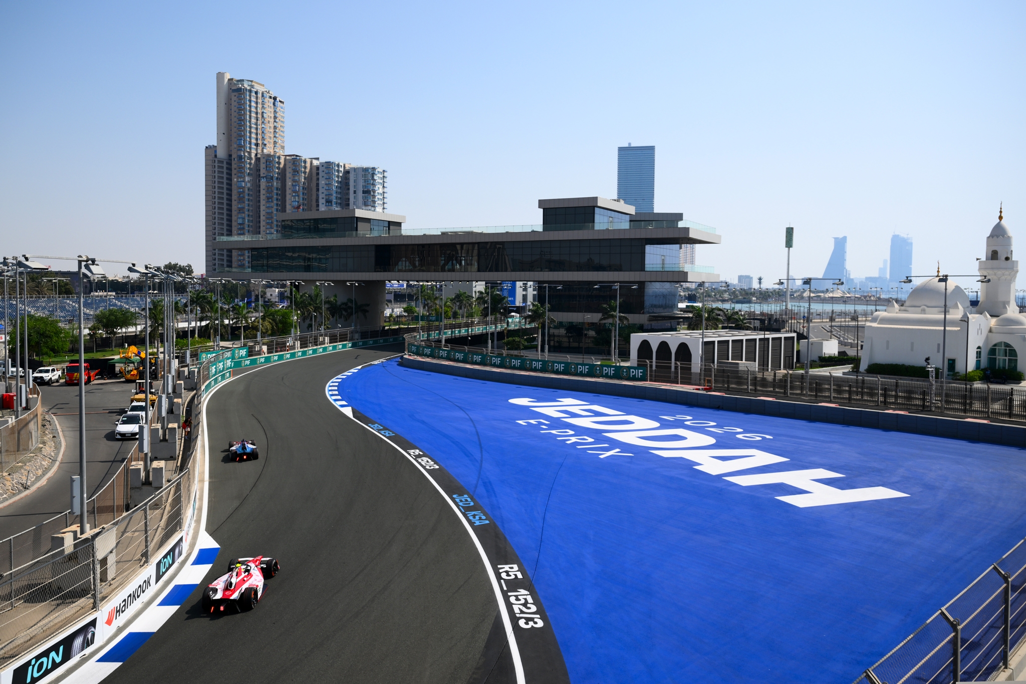 JEDDAH, SAUDI ARABIA - FEBRUARY 14: Taylor Barnard of Great Britain driving the (77) DS Penske DS E-Tense FE25 and Oliver Rowland of Great Britain driving the (1) Nissan Formula E Team Nissan e-4ORCE 05 on track during practice, ahead of the Jeddah E-Prix, Round 5 of the 2026 FIA Formula E World Championship at Jeddah Corniche Circuit on February 14, 2026 in Jeddah, Saudi Arabia. (Photo by Simon Galloway/LAT Images)
