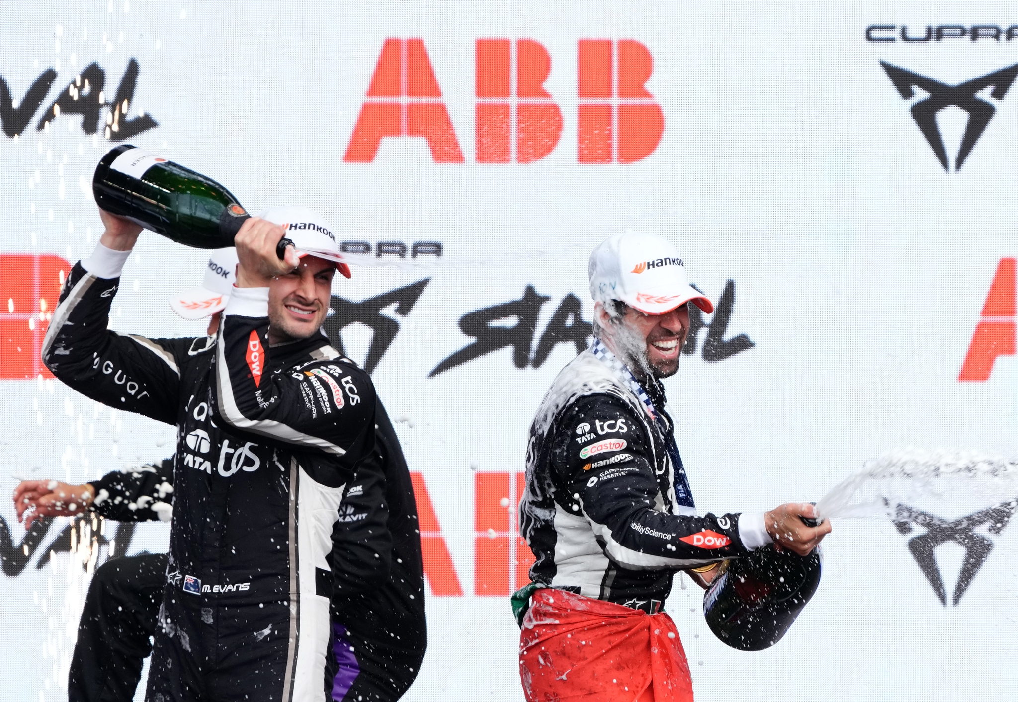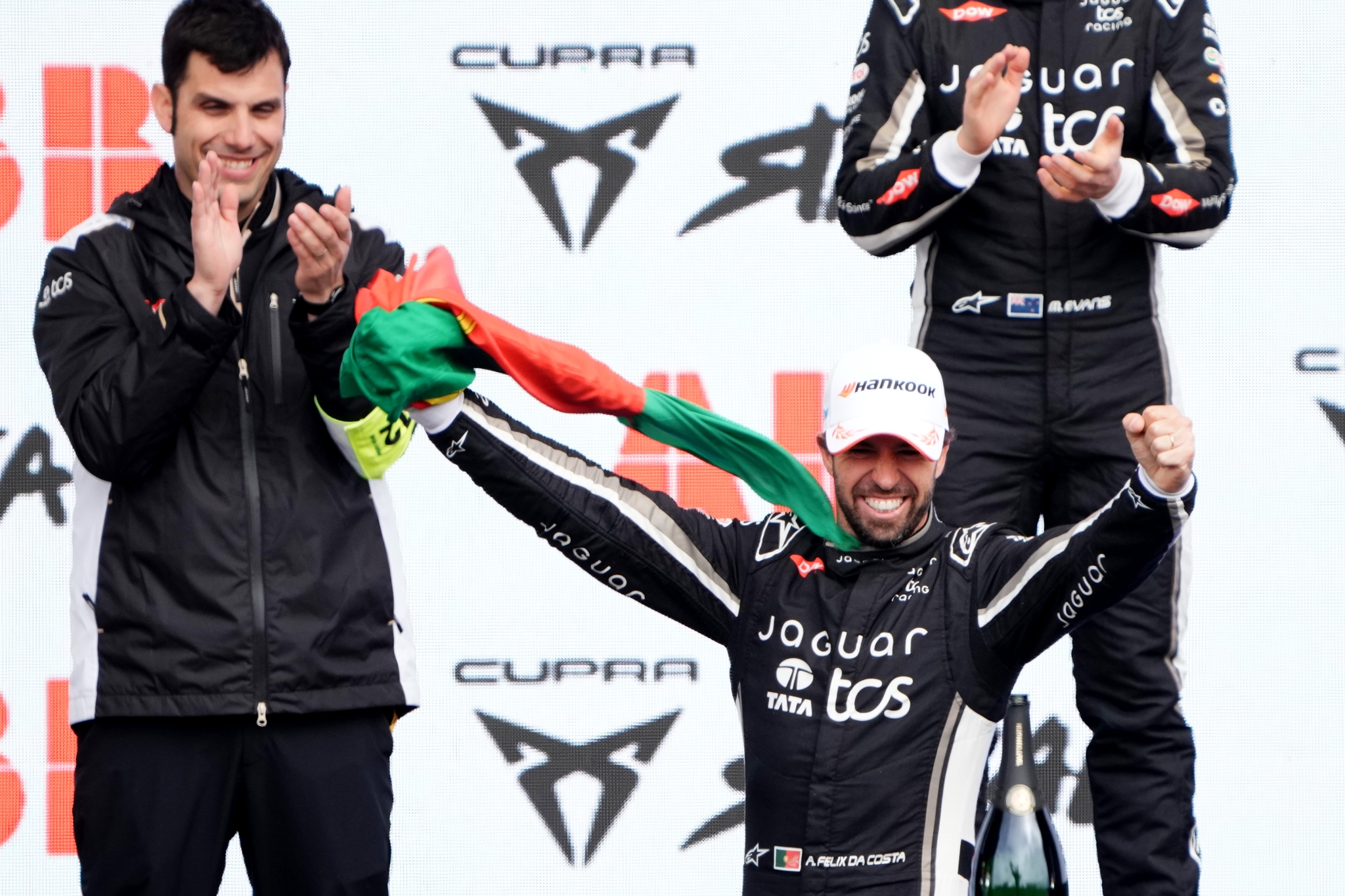MADRID, SPAIN - MARCH 21: Second placed Mitch Evans of New Zealand and Jaguar TCS Racing and Race winner Antonio Felix da Costa of Portugal and Jaguar TCS Racing celebrate on the podium during the Madrid E-Prix, Round 6 of the 2026 FIA Formula E World Championship at Circuito del Jarama on March 21, 2026 in Madrid, Spain. (Photo by Malcolm Griffiths/LAT Images)
