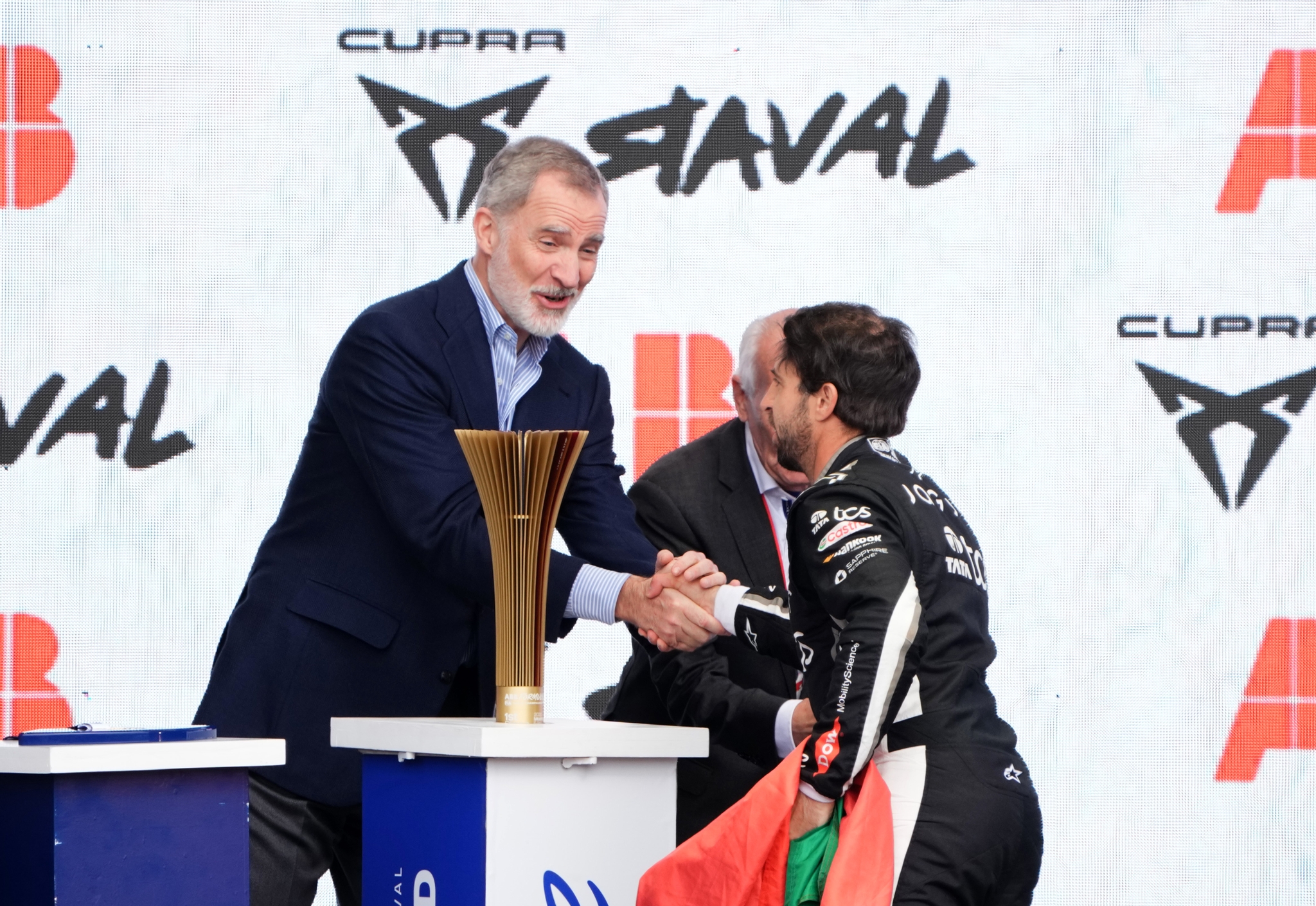 MADRID, SPAIN - MARCH 21: Race winner Antonio Felix da Costa of Portugal and Jaguar TCS Racing is congratulated by His Majesty Felipe VI, King of Spain, on the podium during the Madrid E-Prix, Round 6 of the 2026 FIA Formula E World Championship at Circuito del Jarama on March 21, 2026 in Madrid, Spain. (Photo by Malcolm Griffiths/LAT Images)