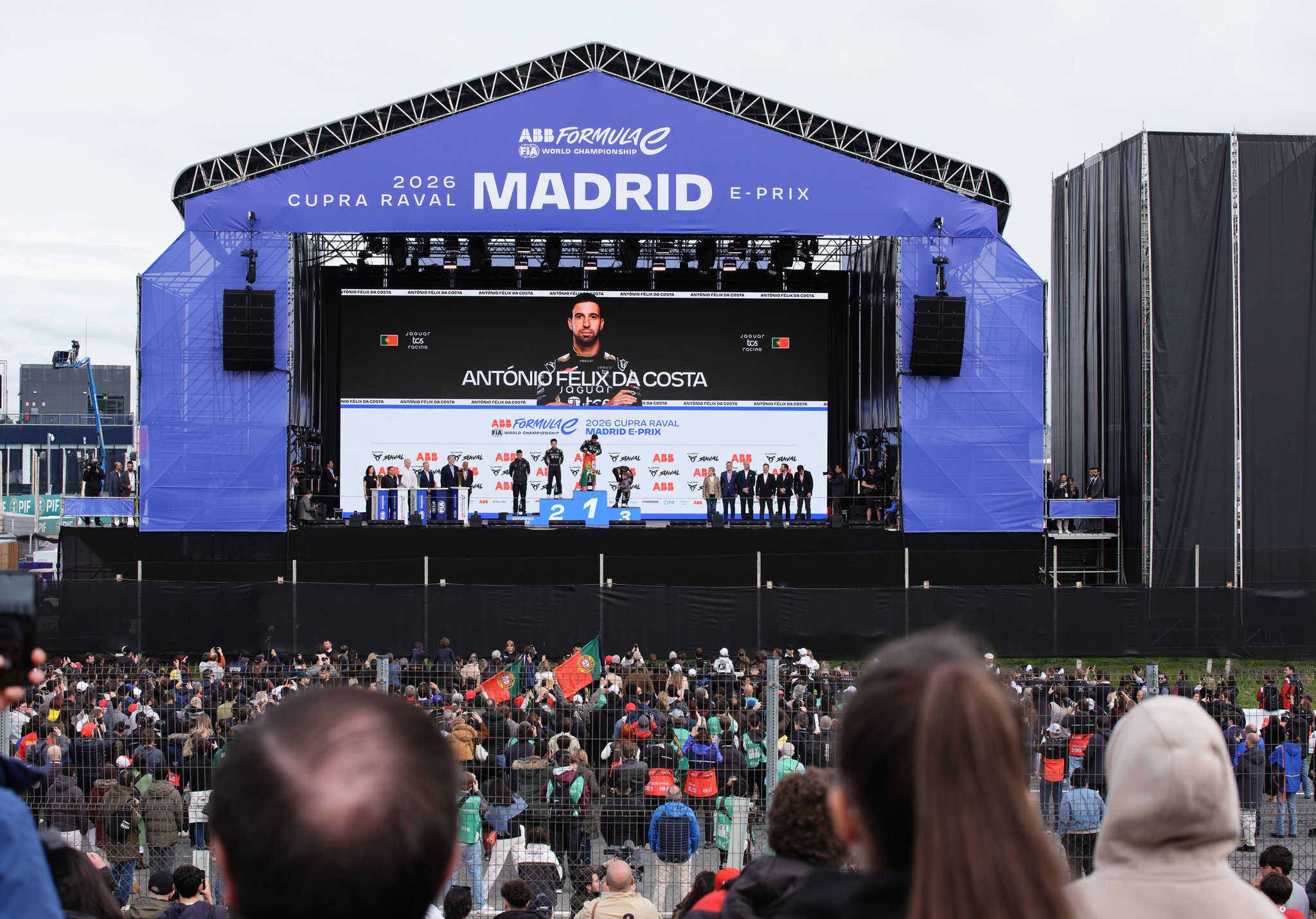 MADRID, SPAIN - MARCH 21: A general view of the podium, featuring Race winner Antonio Felix da Costa of Portugal and Jaguar TCS Racing, Second placed Mitch Evans of New Zealand and Jaguar TCS Racing, and Third placed Pascal Wehrlein of Germany and Porsche Formula E Team during the Madrid E-Prix, Round 6 of the 2026 FIA Formula E World Championship at Circuito del Jarama on March 21, 2026 in Madrid, Spain. (Photo by Malcolm Griffiths/LAT Images)