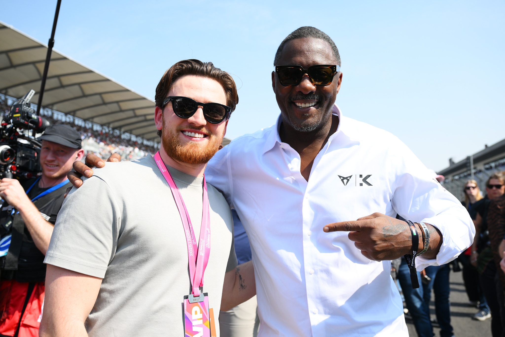 MEXICO CITY, MEXICO - JANUARY 10: Matty Lee, retired British diver, and Idris Elba, Co-owner of CUPRA KIRO, pose for a photo on the grid ahead of the Mexico City E-Prix at Autodromo Hermanos Rodriguez on January 10, 2026 in Mexico City, Mexico. (Photo by Simon Galloway/LAT Images)