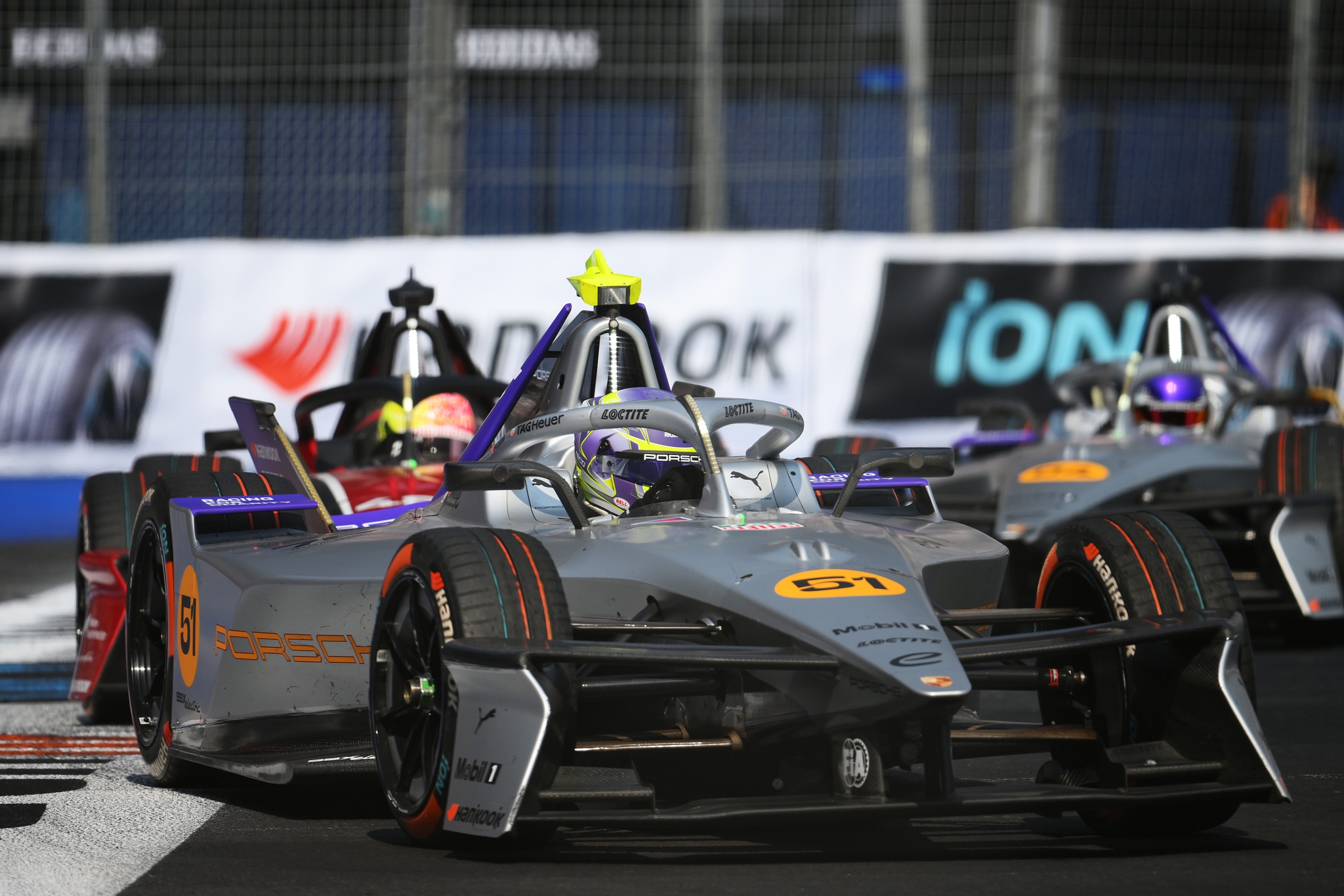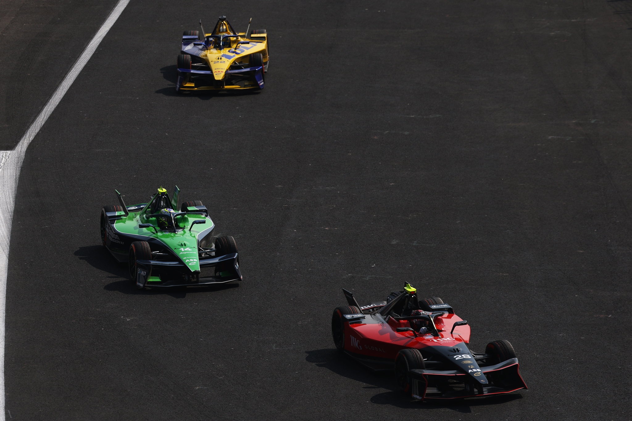 MEXICO CITY, MEXICO - JANUARY 10: Edoardo Mortara of Italy driving the (48) Mahindra Racing Mahindra M12Electro leads Pascal Wehrlein of Germany driving the (94) Porsche Formula E Team Porsche 99X Electric and Nico Muller of Switzerland driving the (51) Porsche Formula E Team Porsche 99X Electric during the Mexico City E-Prix at Autodromo Hermanos Rodriguez on January 10, 2026 in Mexico City, Mexico. (Photo by Simon Galloway/LAT Images)