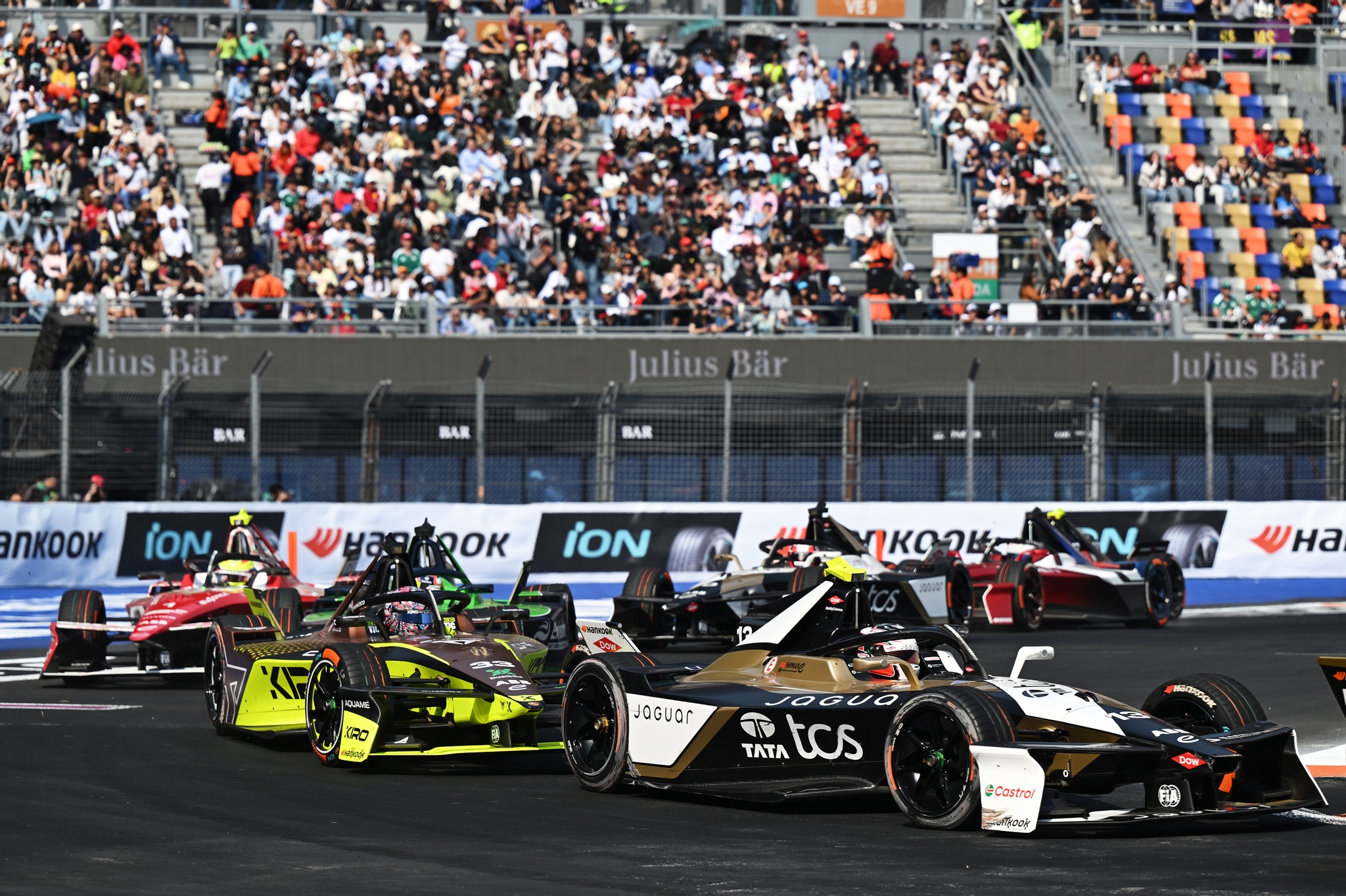 MEXICO CITY, MEXICO - JANUARY 10: Antonio Felix da Costa of Portugal driving the (13) Jaguar TCS Racing Jaguar I-TYPE 7 leads Dan Ticktum of Great Britain driving the (33) CUPRA KIRO Porsche 99X Electric WCG3 during the Mexico City E-Prix at Autodromo Hermanos Rodriguez on January 10, 2026 in Mexico City, Mexico. (Photo by Simon Galloway/LAT Images)