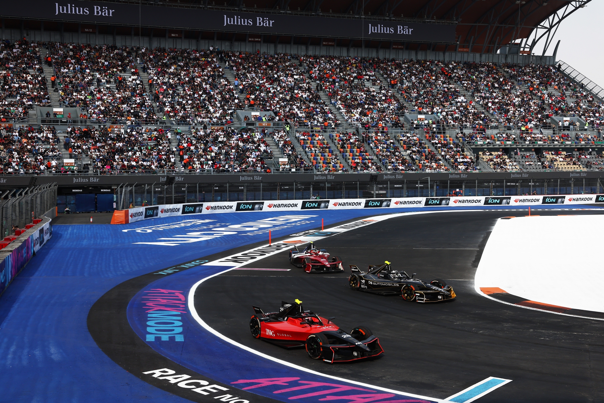 MEXICO CITY, MEXICO - JANUARY 10: Taylor Barnard of Great Britain driving the (77) DS Penske DS E-Tense FE25 leads the field during the Mexico City E-Prix at Autodromo Hermanos Rodriguez on January 10, 2026 in Mexico City, Mexico. (Photo by Zak Mauger/LAT Images)