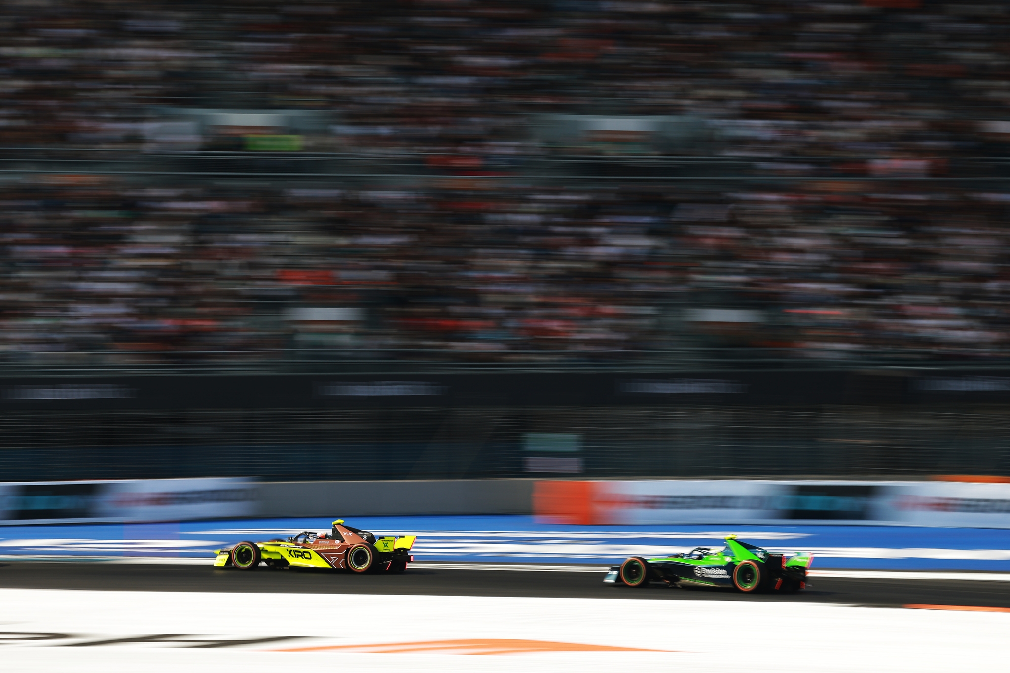 MEXICO CITY, MEXICO - JANUARY 10: Edoardo Mortara of Italy driving the (48) Mahindra Racing Mahindra M12Electro leads Oliver Rowland of Great Britain driving the (1) Nissan Formula E Team Nissan e-4ORCE 05 during the Mexico City E-Prix at Autodromo Hermanos Rodriguez on January 10, 2026 in Mexico City, Mexico. (Photo by Hector Vivas/LAT Images)