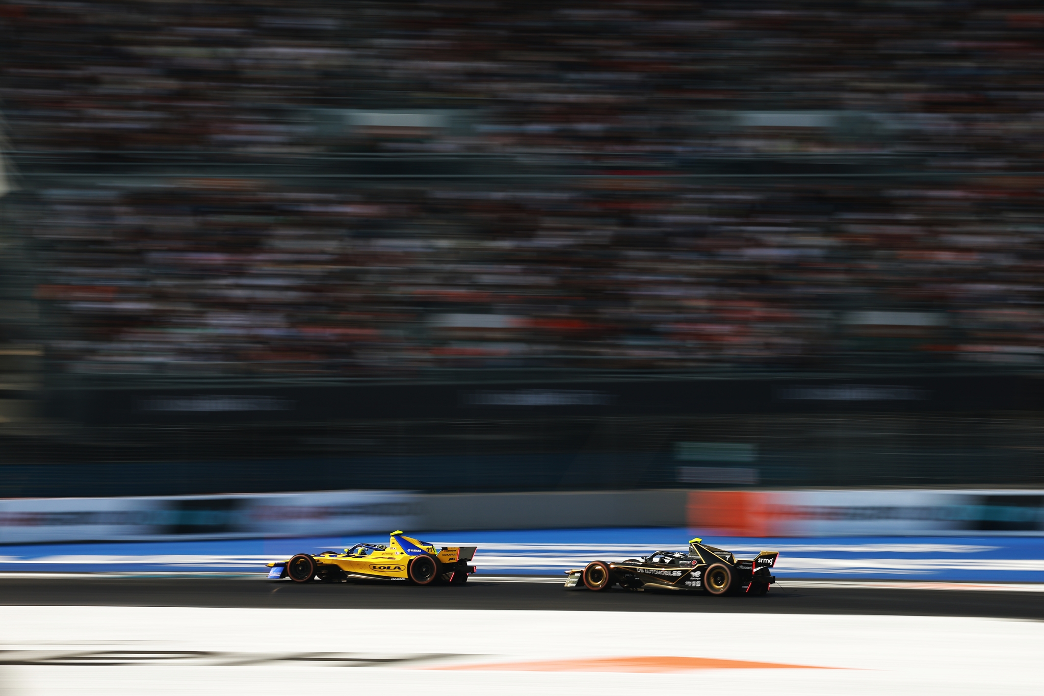 MEXICO CITY, MEXICO - JANUARY 10: Lucas di Grassi of Brazil driving the (11) Lola Yamaha ABT Formula E Team Lola-Yamaha T001 leads Maximilian Gunther of Germany driving the (7) DS Penske DS E-Tense FE25 during the Mexico City E-Prix at Autodromo Hermanos Rodriguez on January 10, 2026 in Mexico City, Mexico. (Photo by Hector Vivas/LAT Images)