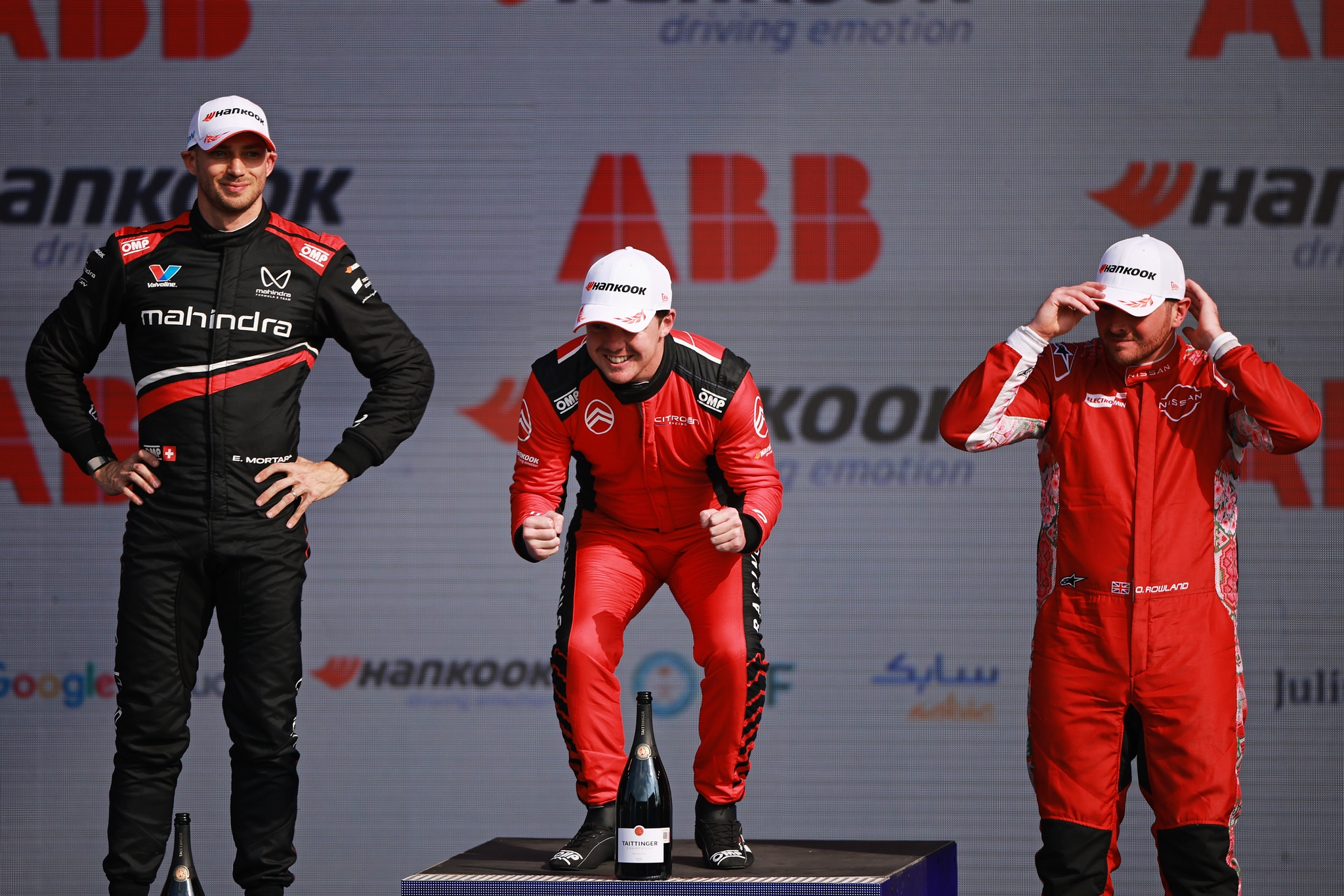 MEXICO CITY, MEXICO - JANUARY 10: Pierre Paul Fery, Race Engineer of Citroen Racing and Third placed Oliver Rowland of Great Britain and Nissan Formula E Team celebrate on the podium during the Mexico City E-Prix at Autodromo Hermanos Rodriguez on January 10, 2026 in Mexico City, Mexico. (Photo by Hector Vivas/LAT Images)