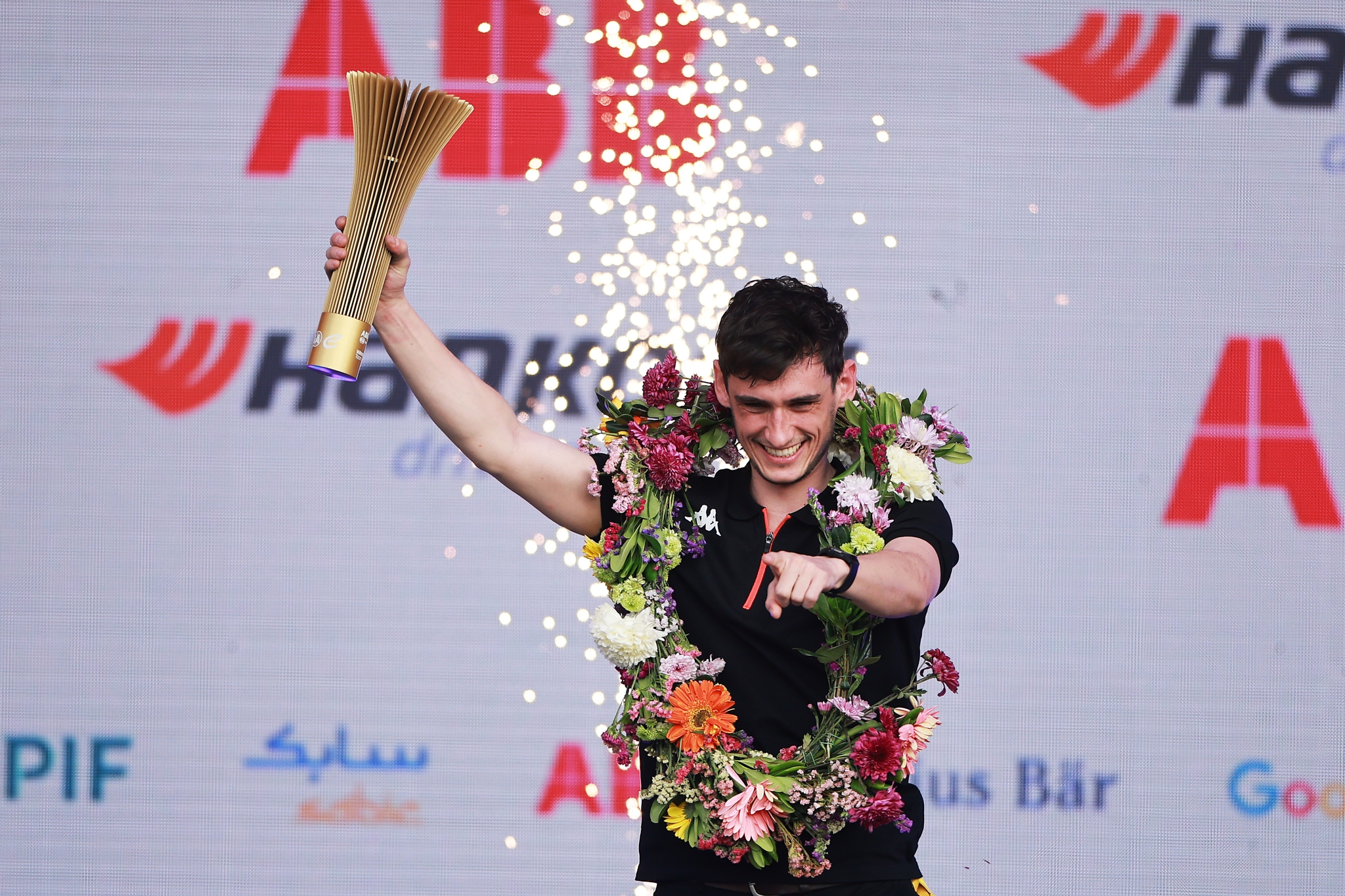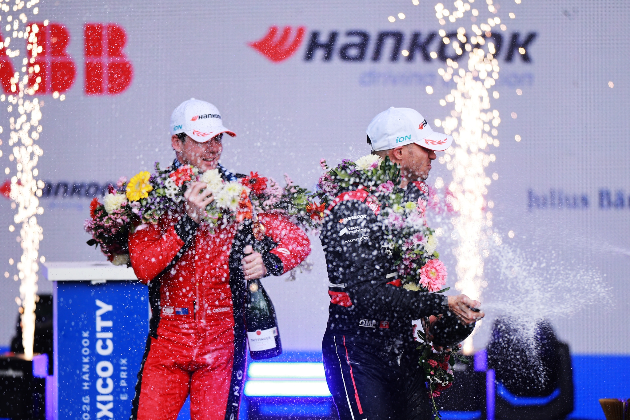 MEXICO CITY, MEXICO - JANUARY 10: Second placed Edoardo Mortara of Italy and Mahindra Racing celebrates on the podium during the Mexico City E-Prix at Autodromo Hermanos Rodriguez on January 10, 2026 in Mexico City, Mexico. (Photo by Zak Mauger/LAT Images)