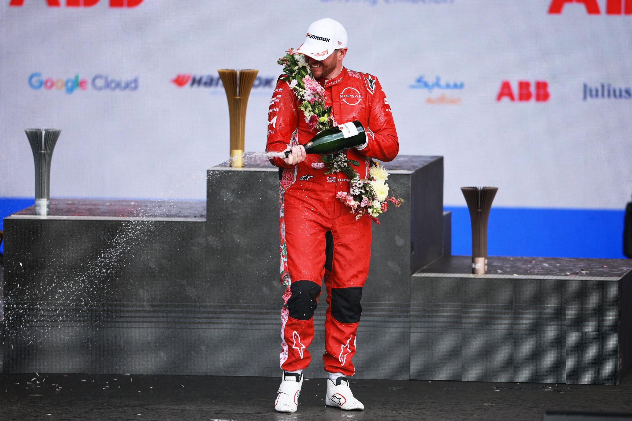 MEXICO CITY, MEXICO - JANUARY 10: Third placed Oliver Rowland of Great Britain and Nissan Formula E Team celebrates on the podium during the Mexico City E-Prix at Autodromo Hermanos Rodriguez on January 10, 2026 in Mexico City, Mexico. (Photo by Simon Galloway/LAT Images)