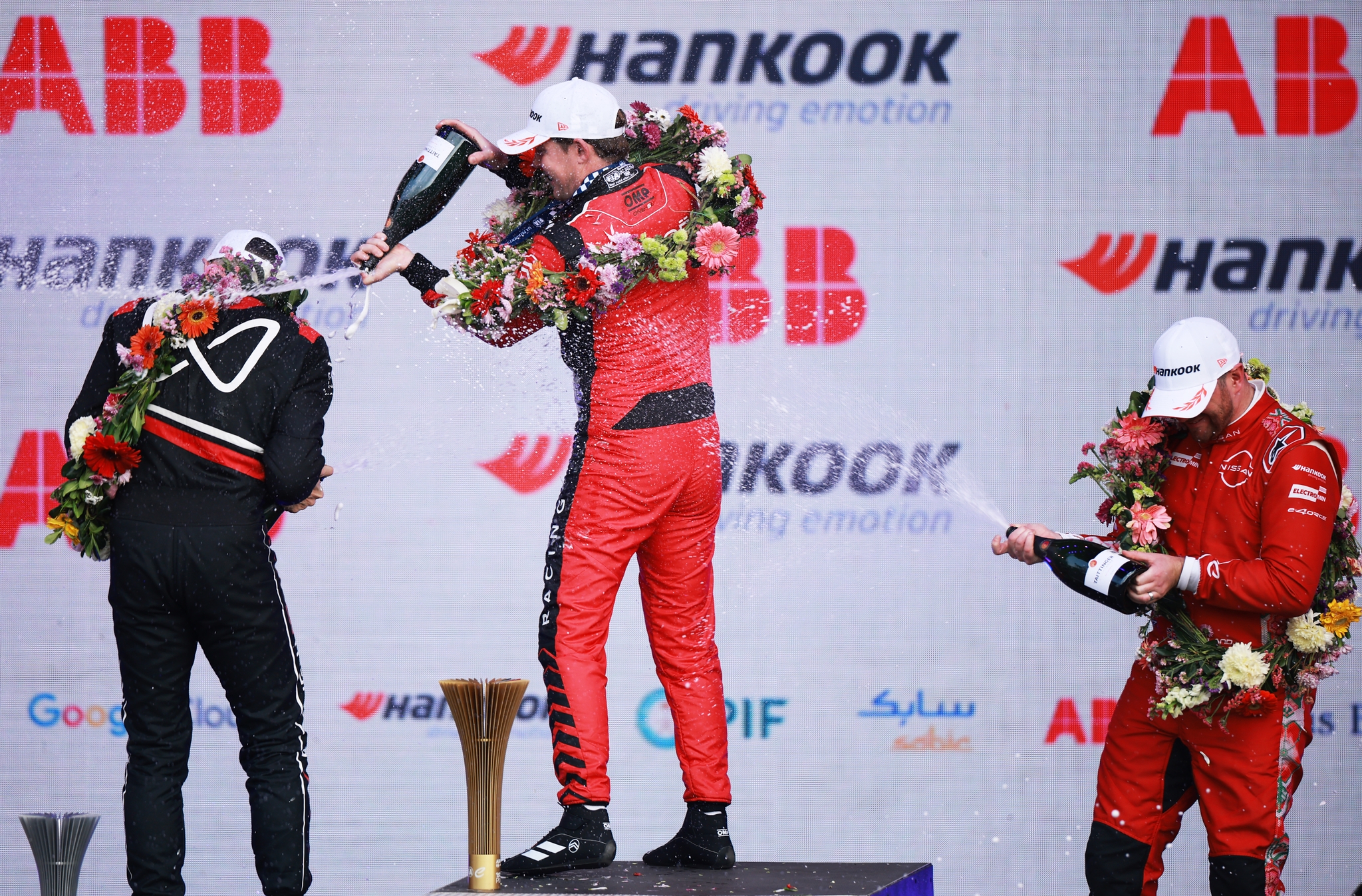 MEXICO CITY, MEXICO - JANUARY 10: Race winner Nick Cassidy of New Zealand and Citroen Racing, Second placed Edoardo Mortara of Italy and Mahindra Racing and Third placed Oliver Rowland of Great Britain and Nissan Formula E Team celebrate on the podium during the Mexico City E-Prix at Autodromo Hermanos Rodriguez on January 10, 2026 in Mexico City, Mexico. (Photo by Hector Vivas/LAT Images)