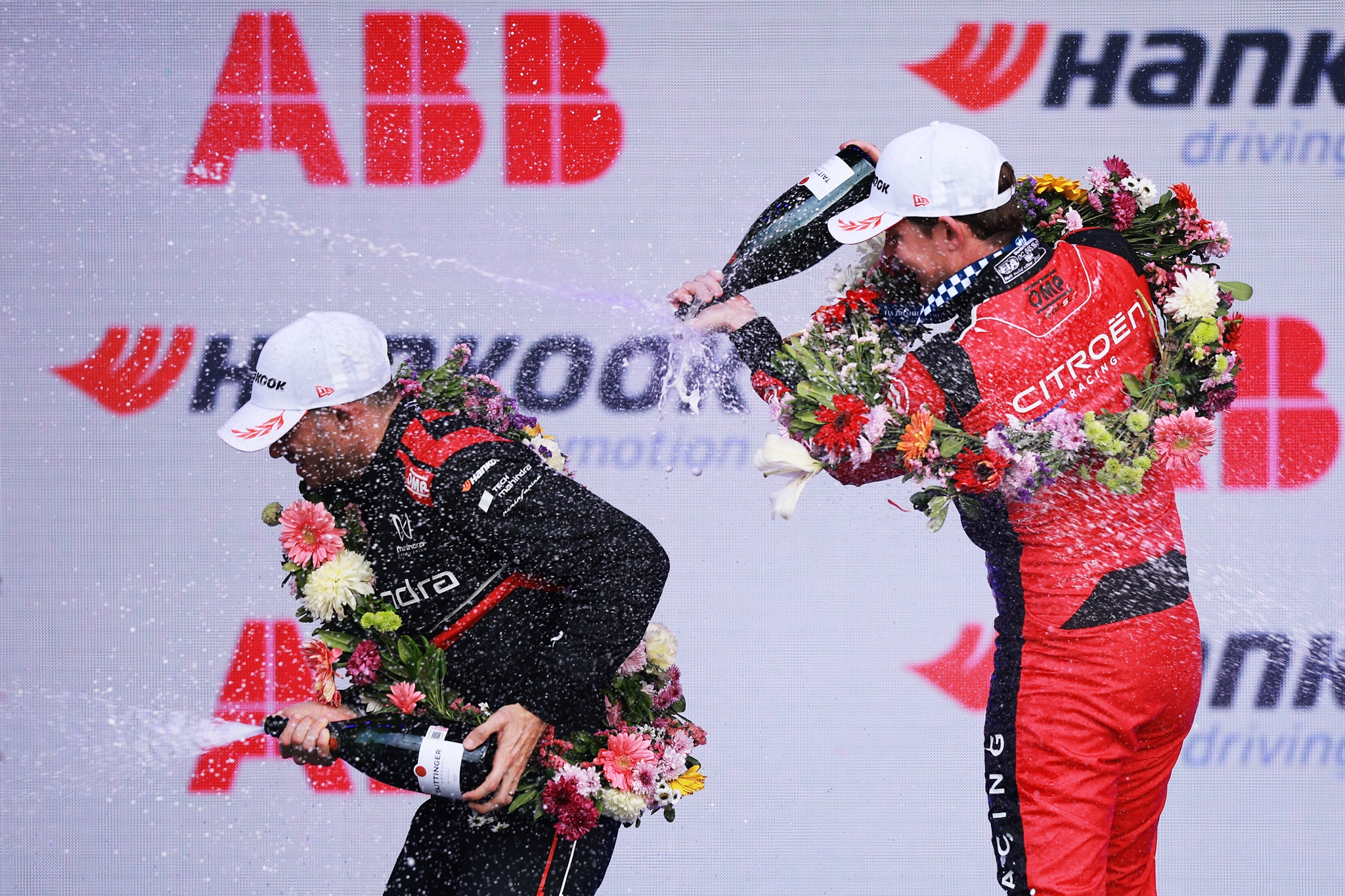 MEXICO CITY, MEXICO - JANUARY 10: Race winner Nick Cassidy of New Zealand and Citroen Racing and Second placed Edoardo Mortara of Italy and Mahindra Racing celebrate on the podium during the Mexico City E-Prix at Autodromo Hermanos Rodriguez on January 10, 2026 in Mexico City, Mexico. (Photo by Hector Vivas/LAT Images)