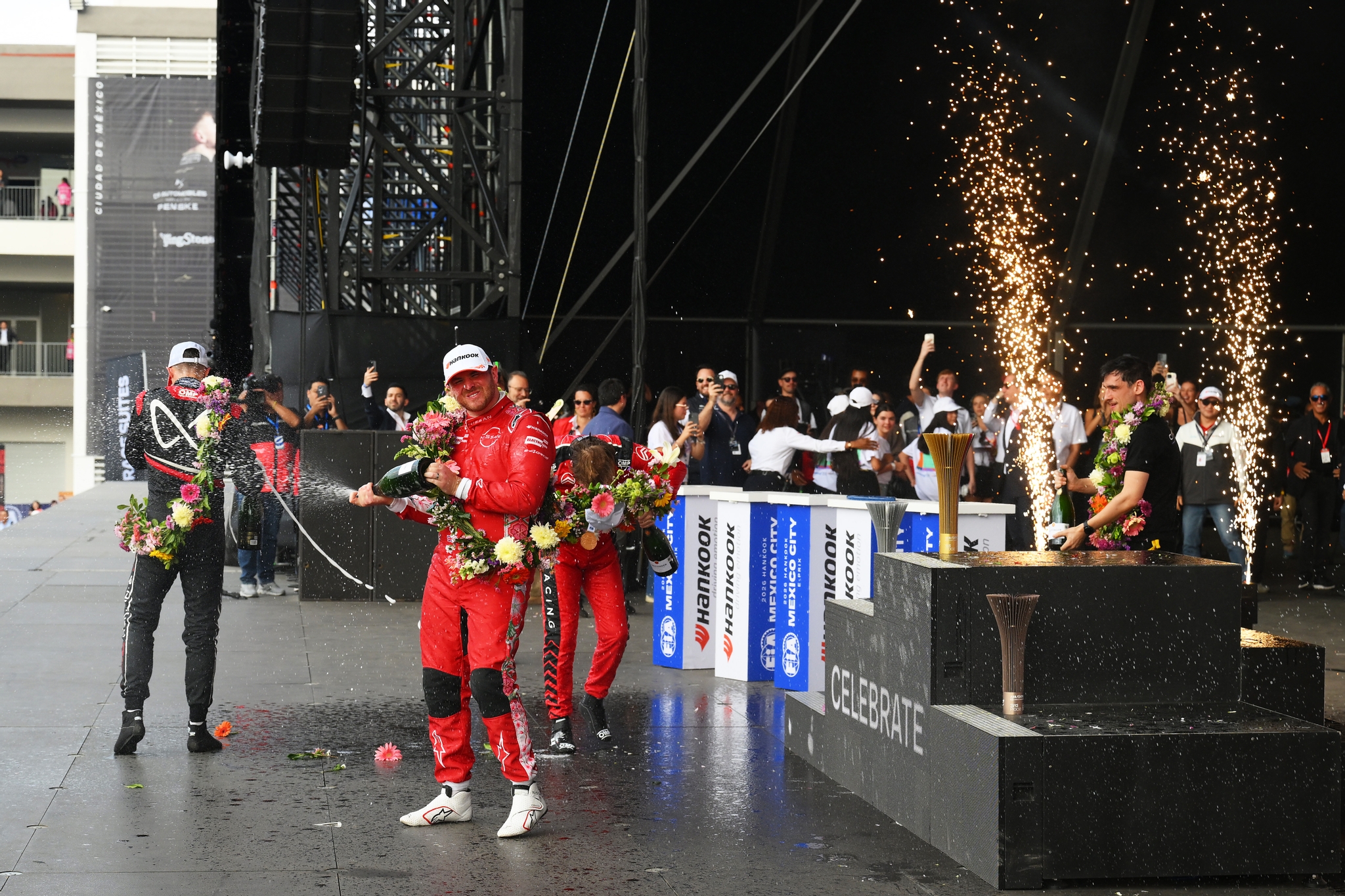 MEXICO CITY, MEXICO - JANUARY 10: Race winner Nick Cassidy of New Zealand and Citroen Racing celebrates on the podium during the Mexico City E-Prix at Autodromo Hermanos Rodriguez on January 10, 2026 in Mexico City, Mexico. (Photo by Simon Galloway/LAT Images)