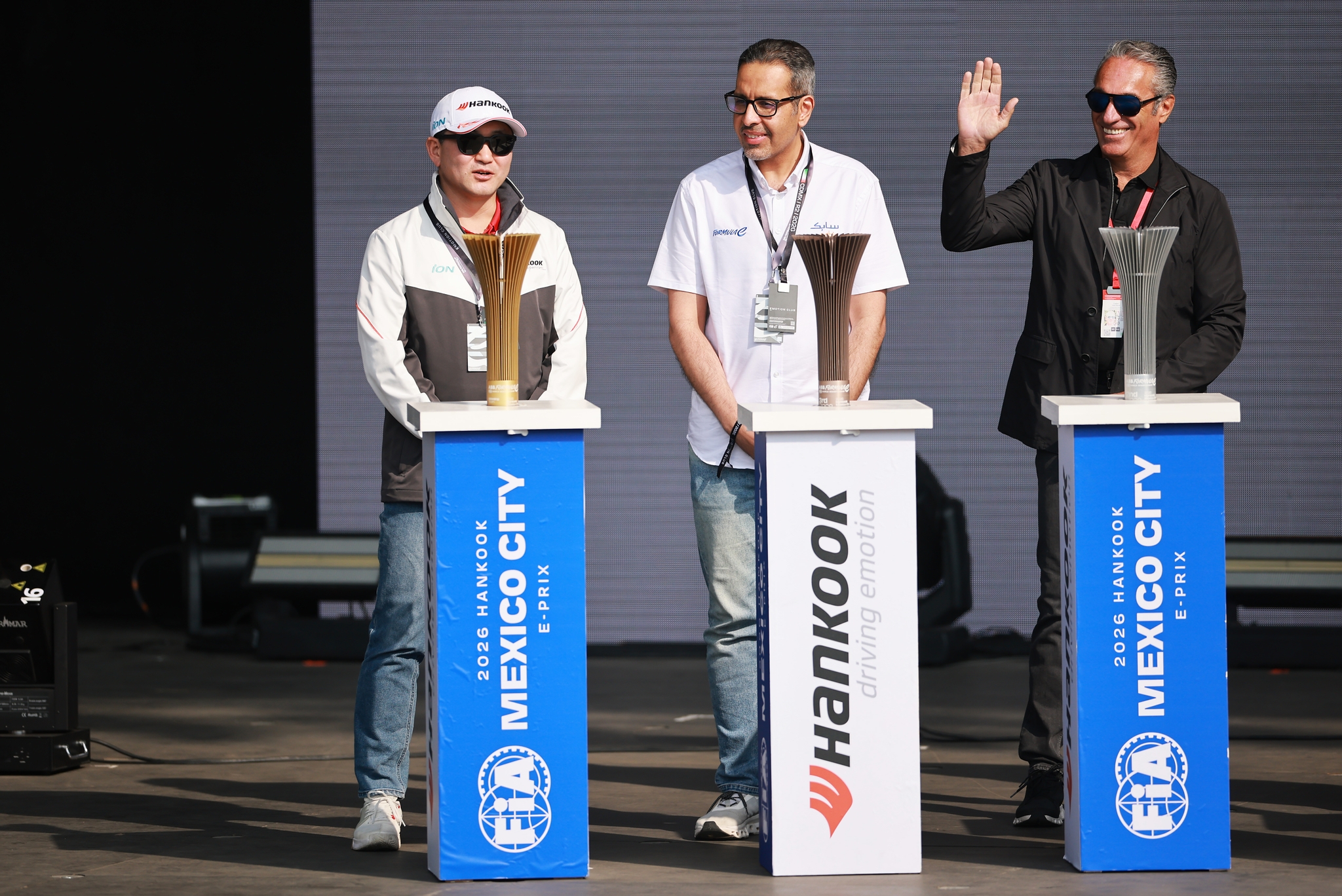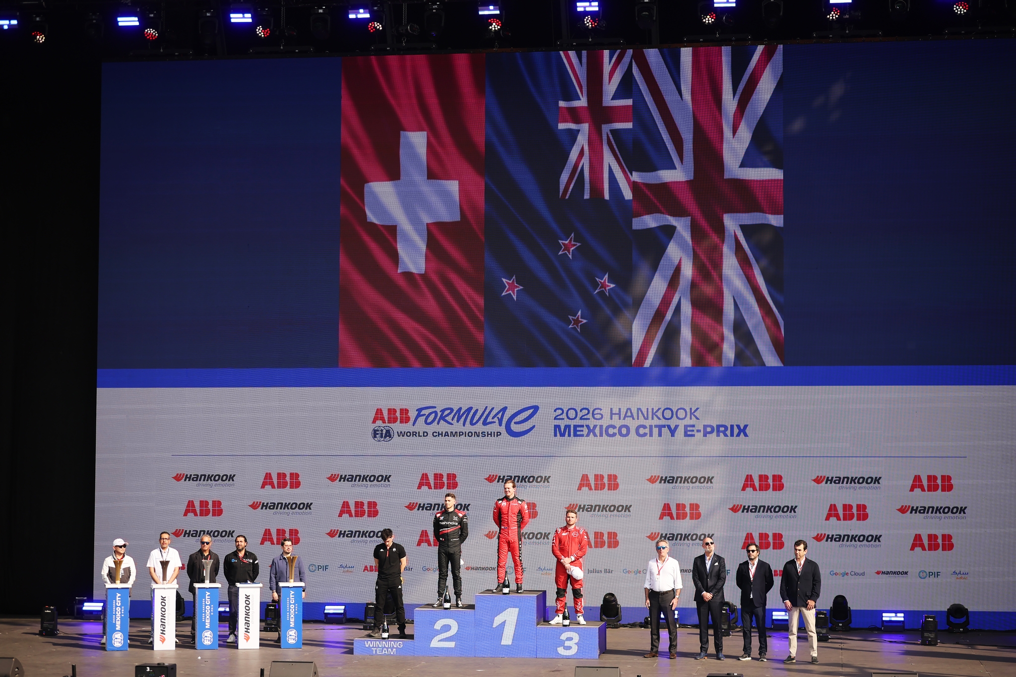 MEXICO CITY, MEXICO - JANUARY 10: Trophy delegates on the podium during the Mexico City E-Prix at Autodromo Hermanos Rodriguez on January 10, 2026 in Mexico City, Mexico. (Photo by Hector Vivas/LAT Images)
