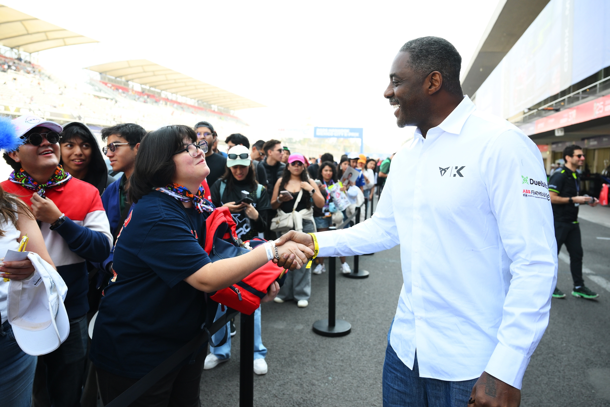MEXICO CITY, MEXICO - JANUARY 10: Idris Elba, Co-owner of CUPRA KIRO, greets a fan ahead of the Mexico City E-Prix at Autodromo Hermanos Rodriguez on January 10, 2026 in Mexico City, Mexico. (Photo by Simon Galloway/LAT Images)